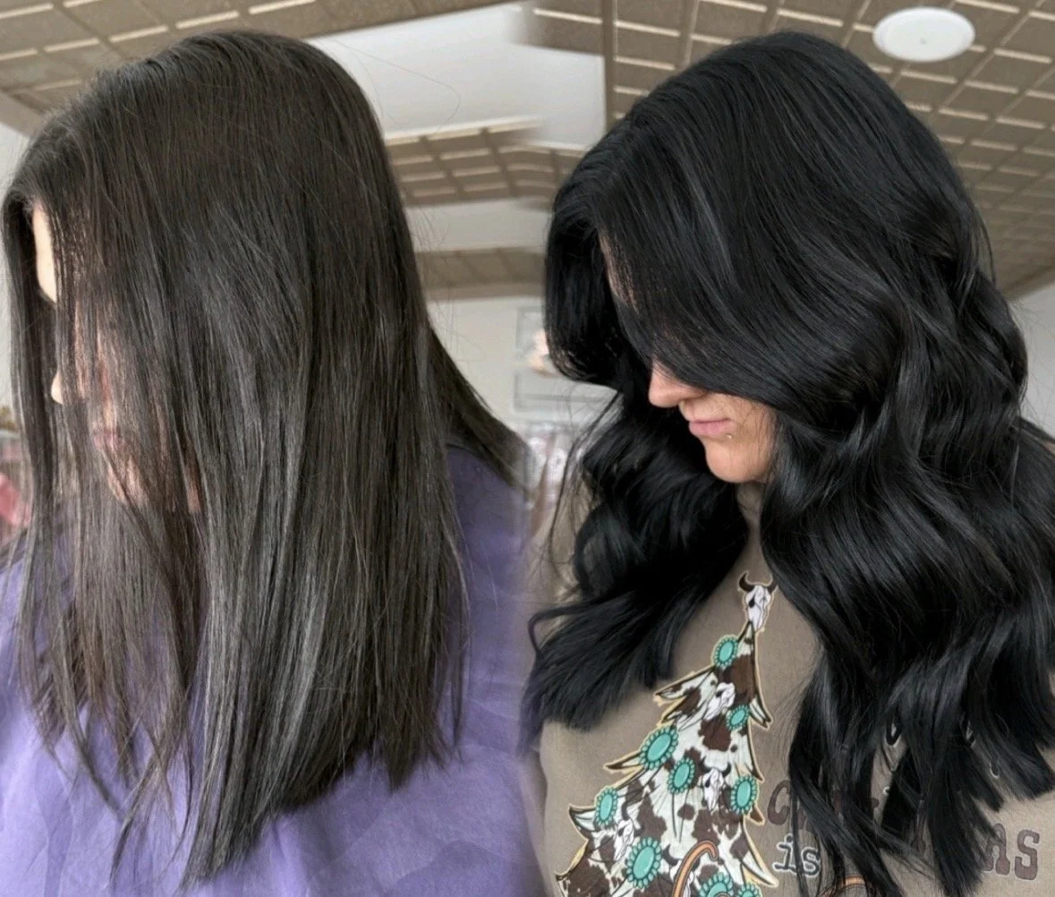Before & Afters + Color Combos Our Clients Client is wearing 2 rows (6 wefts) of Erika. Client is wearing one 18in row (3 wefts) of Pirl and Brennae. The extensions were cut to match her natural length. Client is wearing 2 rows (7 wefts) of custom colored 22in extensions in shade April. Client is wearing one row (3 wefts) of Adi and Brennae. Client is wearing 2 rows (6 wefts) of 18in extensions in color Pirl and Kelci. Client is wearing 2 rows (5 wefts) of 18in extensions in color Riley.